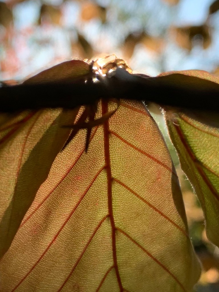 The combination of my iPhone camera and the sun and this leaf is stunning, isn’t it? I stopped to take the picture only because of how pretty the tree was. The closer I got, the more I noticed. But the camera lens captured more than I could see with my own eyes.
